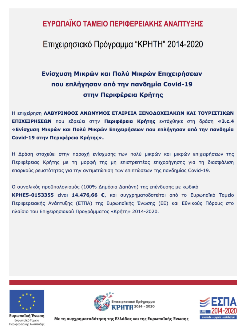 που εδρεύει στην Περιφέρεια Κρήτης εντάχθηκε στη δράση «3.c.4 «Ενίσχυση Μικρών και Πολύ Μικρών